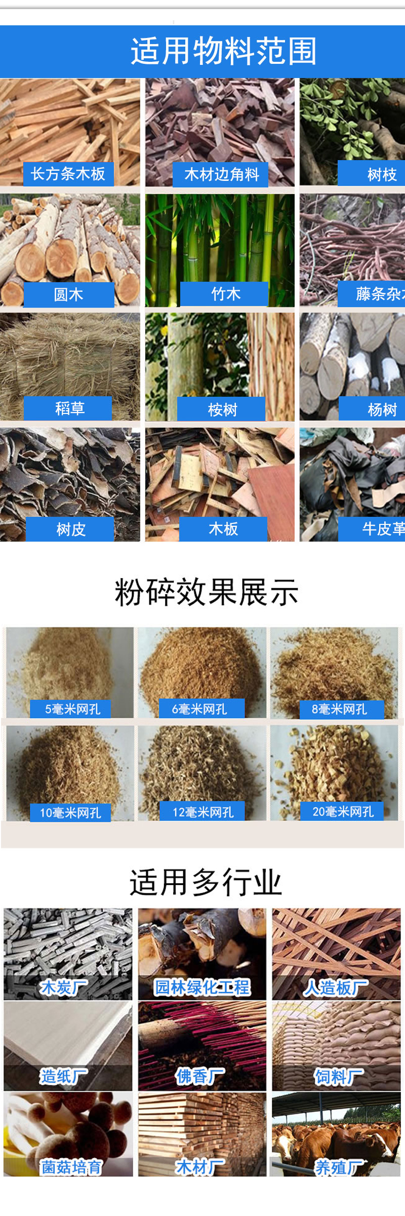 4、木屑機集切片、粉碎為一體,可切屑直徑1–45公分的枝杈及枝干,還可用于竹、茅草、玉米稈、高梁稈等纖維質稈狀物料的切屑。